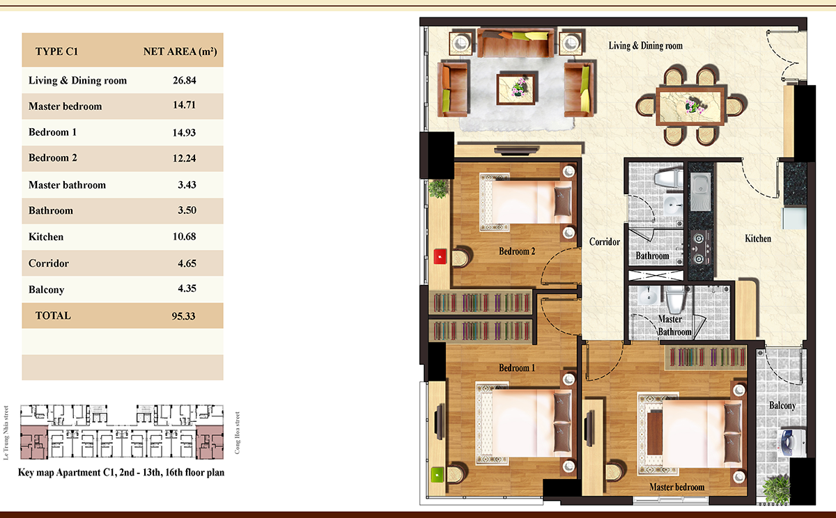 Các căn hộ có các loại diện tích 69 – 70 – 95m2 có từ 2 – 3 phòng ngủ, 2wc, các căn hộ đều có ban công tạo sự thoáng mát.