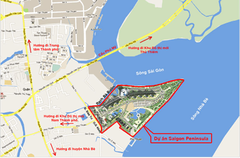Dự án công viên Mũi Đèn Đỏ Saigon Peninsula tiếp giáp với sông Sài Gòn và sông Nhà Bè là 2 tuyến hàng hải rất quan trọng tại Sài Gòn và cũng là là cửa ngõ kết nối Khu Đô thị cảng Hiệp Phước, Tân Cảng – Cát Lái và Tân Cảng – Nhơn Trạch cũng như các tỉnh miền Tây.
