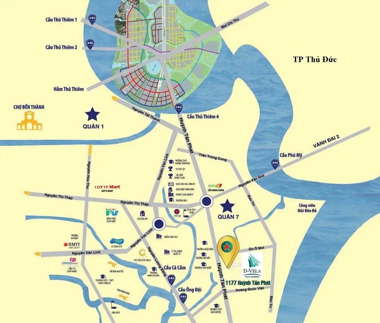 Vị trí địa chỉ dự án căn hộ D-Velaquận 7 tại 1177 Huỳnh Tấn Phát, P. Phú Thuận, Q. 7, Tp. HCM rất thuận lợi, di chuyển dễ dàng làm cho công việc của bạn trở nên hiệu quả hơn. Tiện ích hiện hữu nhiều khi dự án nằm giữa lòng thành phố sầm uất như thế này.