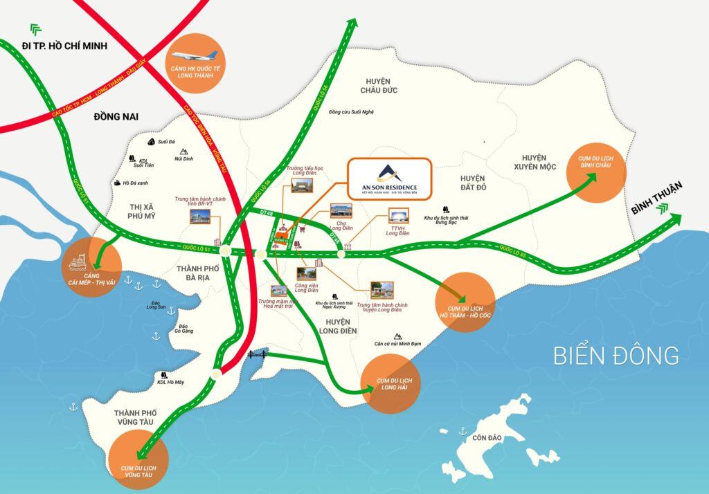 Vị trí dự án An Sơn Residence liền kề đường quốc lộ 44A đến Khu du lịch Hồ Cốc – Vũng Tàu – Long Hải. Từ dự án, cư dân di chuyển về TP HCM khoảng 60 phút di chuyển. Ngoài ra, dự án An Sơn Residence được quy hoạch kết nối đồng bộ với các tuyến giao thông liên tỉnh và liên vùng như: tuyến đường huyết mạch Quốc lộ 51, Cao tốc TPHCM – Long Thành – Dầu Giây, tỉnh lộ 55, dự án cao tốc Biên Hòa – Vũng Tàu sắp triển khai …