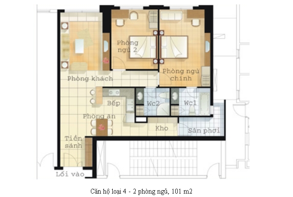 • Căn hộ kiểu 3 được bố trí ở phần giữa các block A, B và C, có diện tích 104m2, 2 phòng ngủ, bếp đóng.