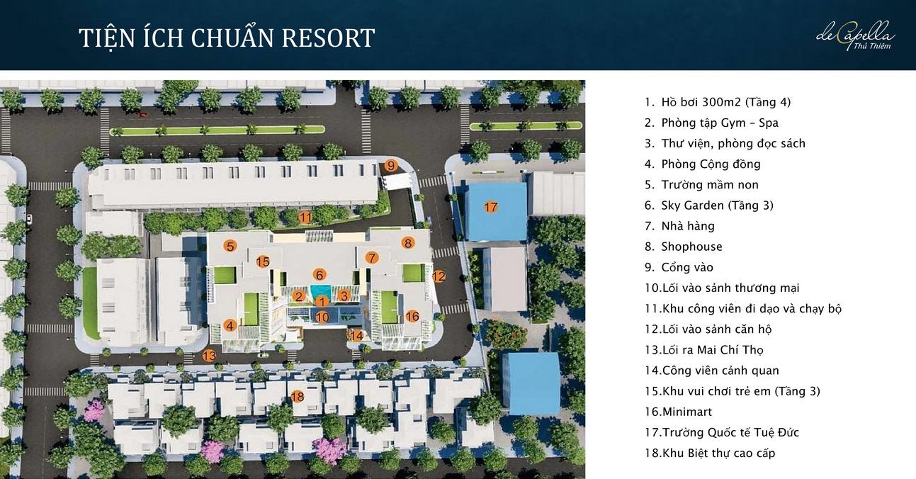 Khu tiện ích De Capella gồm: Ba tầng khối đế khu thương mại cao cấp De Capella, tích hợp rạp chiếu phim, siêu thị, Spa thẩm Mỹ, GYM Yoga, vườn treo trên không, trường mầm non, khuôn viên hay các khu nhà hàng ăn uống , cửa hàng tiện ích và đặc biệt là hồ bơi nước tràn hình hoa mai tạo điểm nhấn tại tầng 4.
