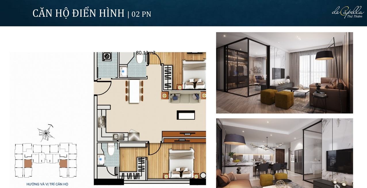 Thiết kế chi tiết dự án căn hộ De Capella đa dạng diện tích từ 51 – 97m2, được thiết kế từ 1 – 3 phòng ngủ. Các căn hộ thông thoáng, các phòng đều có mặt tiếp xúc với không gian bên ngoài. Đặc biệt, căn hộ nào cũng có ban công riêng và logia, thiết kế hiện đại tạo mỹ quan và sự sang trọng cho toàn dự án.