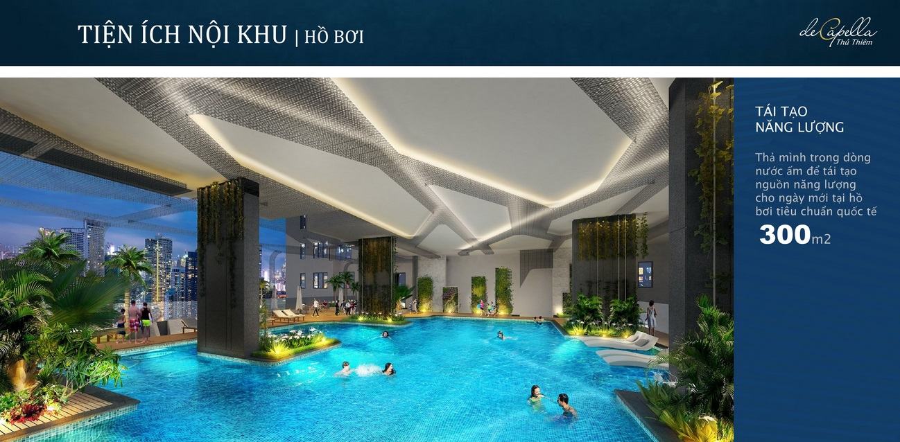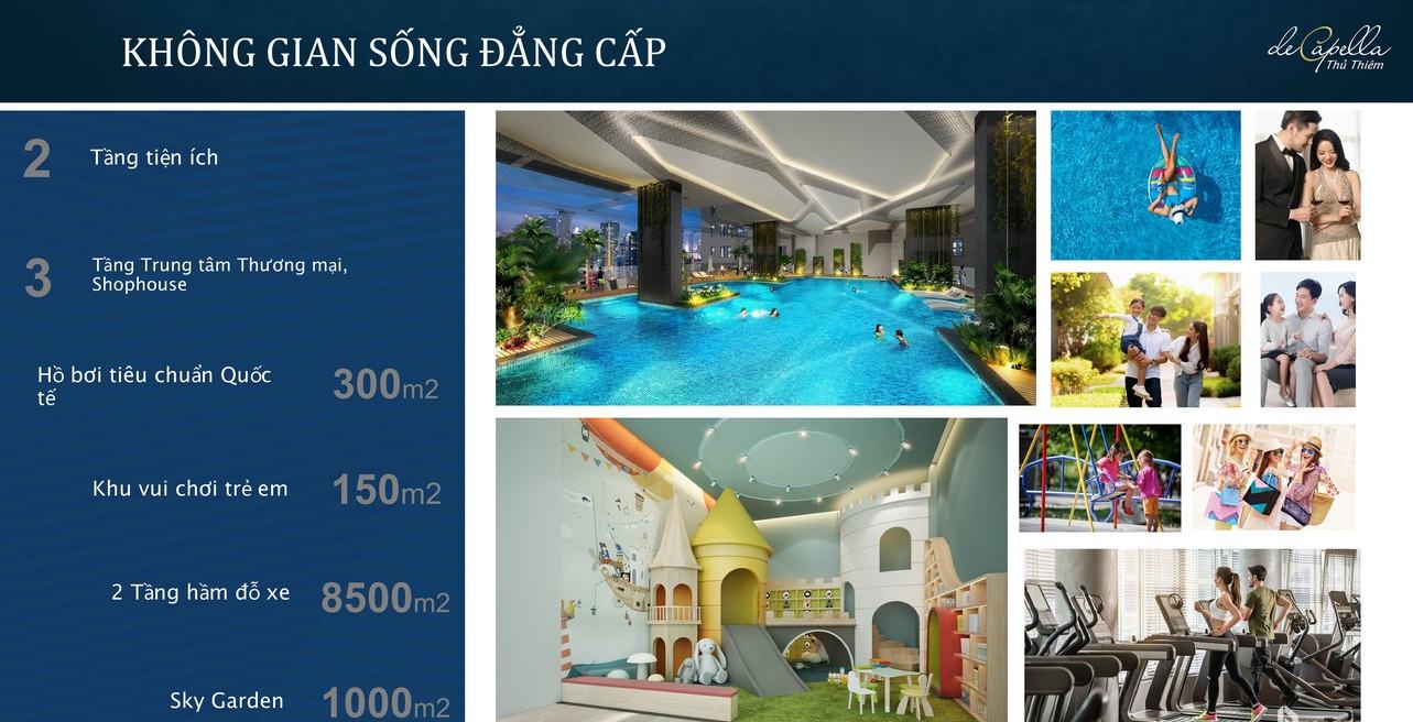 Căn Hộ Decapella được thiết kế đầy đủ các tiện ích cao cấp như trung tâm thương mại, khu mua sắm hồ bơi tràn, khu vui chơi giải trí , công viên đi bộ .