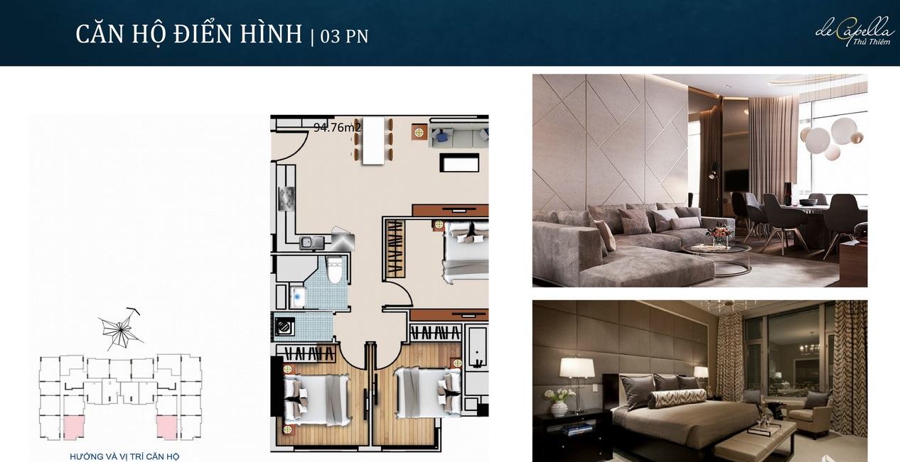 Căn Hộ De Capella tọa lạc ngay trung tâm bán đảo Thủ Thiêm – mặt tiền Đại Lộ Vòng Cung – Lương Định Của, Phường Bình Khánh, TP. Thủ Đức.