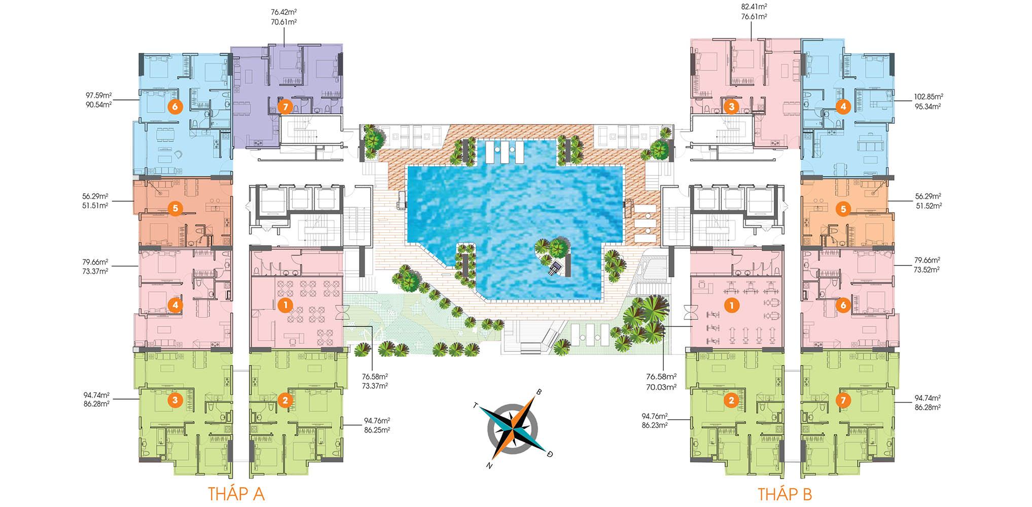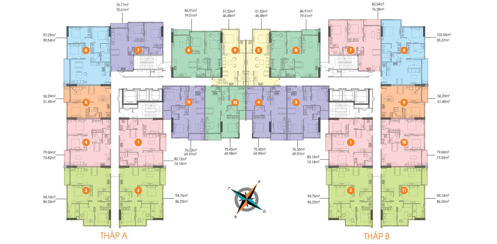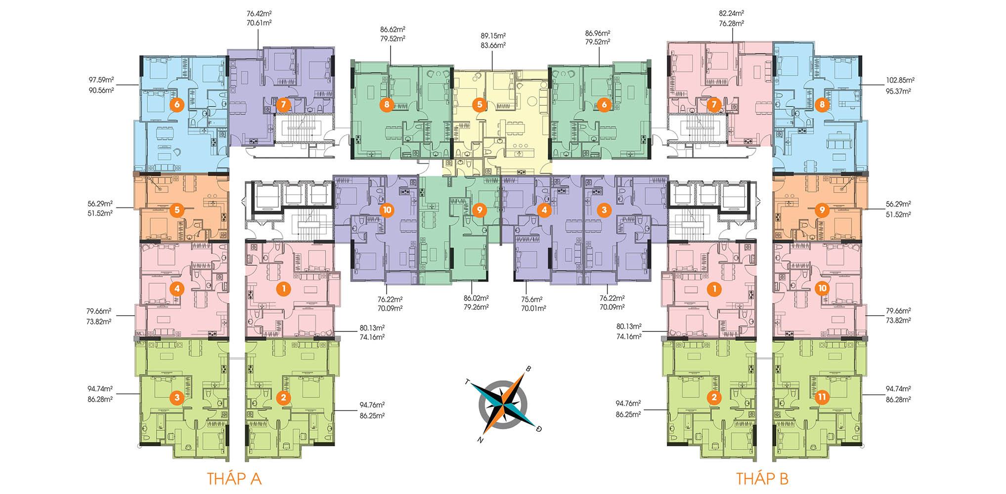 Các căn hộ được bố trí từ tầng 4 đến tầng 21. Với 2 toà Tháp A và B với từ 7 – 11 căn/ tầng. Được thiết kế từ 1 – 3 Phòng ngủ. Mặt bằng căn hộ được thiết kế theo hình chữ U, bố trí phân bổ view hợp lý, thông thoáng, giúp đối lưu không khí rất tốt.