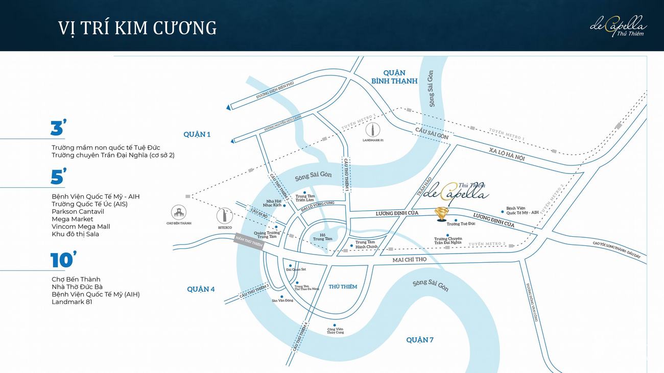 De Capella sở hữu một vị trí đắc địa chỉ 5 phút đến Chợ Bến Thành quận 1, Land mart 81 Bình Thạnh, Cao tốc Long Thành Dầu Dây, 10 Phút đến Khu du lịch Suối Tiên, Sân Golf Long Thành , khu đô thị Phú Mỹ Hưng.