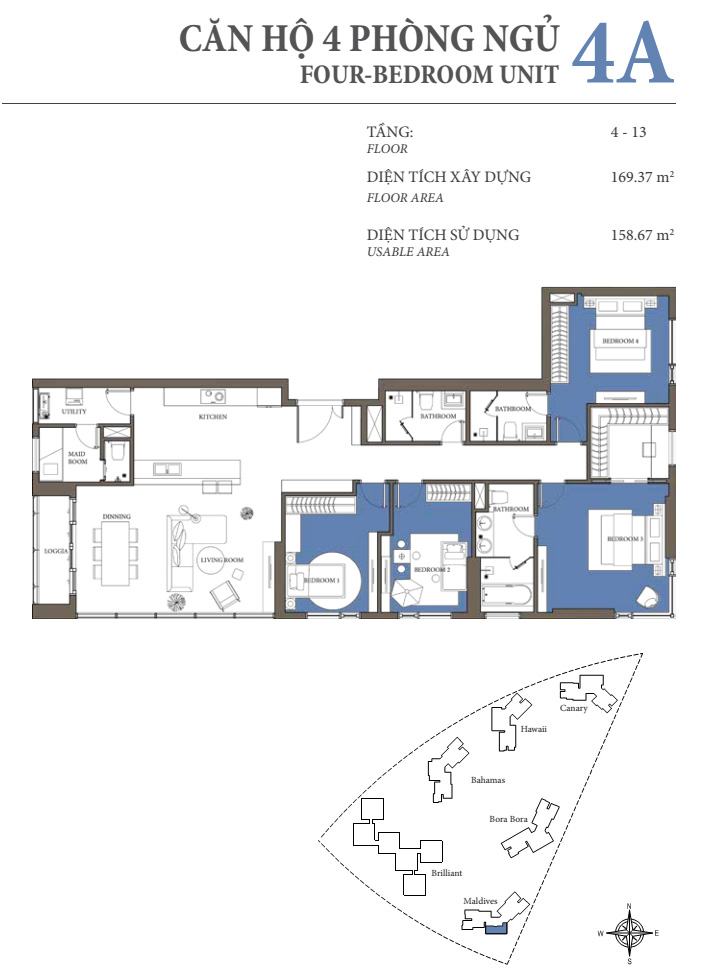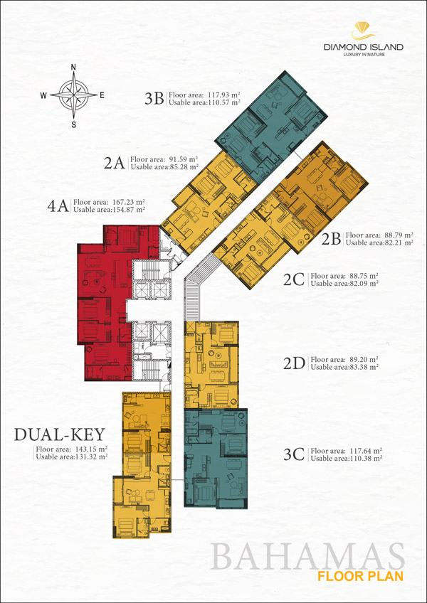 Diamond Island tổng thể có 6 tòa tháp bao gồm: Canary, Hawaii, Bora Bora, Bahamas, Maldives, Brilliant. Được thiết kế theo phong cách tổ ong lệch độc đáo, hướng đến việc tối đa hoá view và ánh sáng đến toàn bộ căn hộ trong dự án.