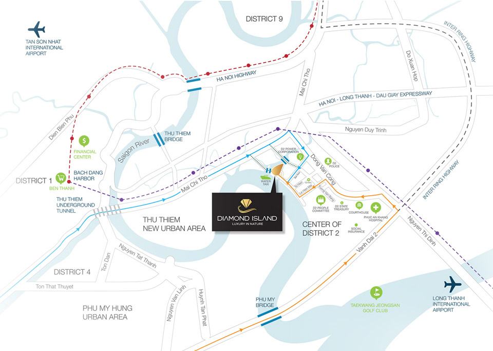Dự án Diamond Island nổi bật với vị trí độc tôn hoàn toàn khác biệt so với các dự án khác trong khu vực. Từ vị trí của Diamond Island quý cư dân chỉ mất 5 phút để Khu Đô Thị Mới Thủ thiêm- nơi quy hoạch rất nhiều dự án mang đẳng cấp quốc tế như (khu phức hợp thể thao giải trí quy mô 39ha, thành phố đế vương với tháp quan sát lên đến 86 tầng…), chỉ mất 10 phút để đến trung tâm thành phố thông qua đại lộ Mai Chí Thọ và hầm Thủ Thiêm bên cạnh đó việc di chuyển về phía Nam của thành phố thông qua cầu Phú Mỹ chỉ mất từ 15-20 phút.