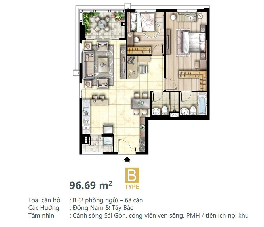 Tầng 1 – 17: Căn hộ 1 – 3 phòng ngủ, diện tích từ 74 – 125 m2,chiều cao thông thủy từ sàn đến trần là 3,2 m2