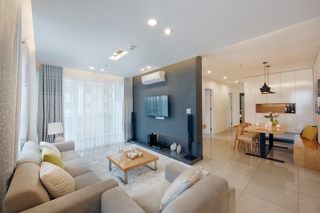 Nội thất được chắt lọc kỹ càng đảm bảo về chất lượng lẫn độ sang trọng, tính ứng dụng và được sắp xếp bài trí khoa học nên không hề bị rối mắt mà lại trở thành những điểm nhấn tôn vinh vẻ đẹp căn hộ.
