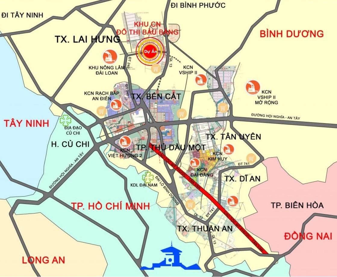 Dự án Dragon City tọa lạc tại trung tâm khu công nghiệp và dịch vụ Bàu Bàng nằm trên tuyến đường huyết mạch nối liền các cụm KCN Bàu Bàng với KCN Chơn Thành, KCN Becamex, KCN Mỹ Phước 1, 2, 3, 4,.. Ngoài ra, Dragon City cũng chỉ cách Đại lộ Bình Dương (Quốc lộ 13) 800m, cao tốc Mỹ Phước Tân Vạn 2 km.