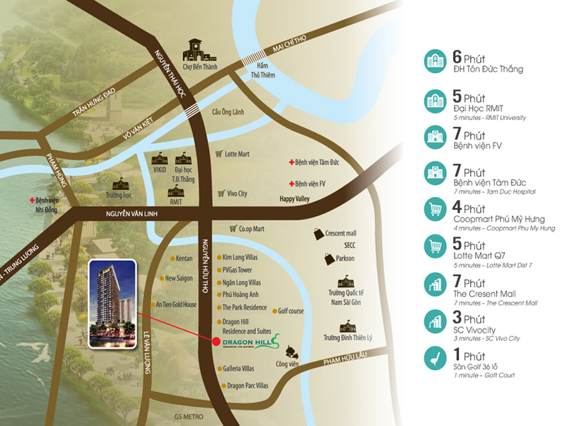 Với vị trí đắc địa nhất khu nam, nằm trên mặt tiền đường Nguyễn Hữu Thọ dự án Dragon Hill Resedence and Suites là dự án có vị trí tuyệt vời đáng sống nhất. Bên cạnh đó dự án nằm trong quần thể khu đô thị Dragon City với rất nhiều những dự án biệt thự, nhà phố, căn hộ tạo nên một quần thể tiện ích, một khu đô thị văn minh. Tai vị trí của dự án nằm ngay sát trung tâm thành phố, đi về trung tâm chỉ có 10 phút, cách Phú Mỹ Hưng 2 phút đi xe, vậy thì còn chần chừ và đắn đo gì cho khu vực này nữa. Nơi đây hội tụ đầy đủ cho môt khu đô thị đáng sống nhất Đẹp- Yên Tĩnh- Gần trung tâm..