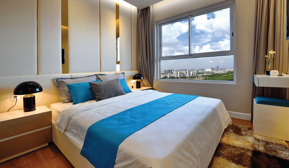 Phòng ngủ vẫn đi theo tông màu chủ đạo của căn hộ, nên luôn giữ được nét trẻ trung cho không gian thư giãn. Việc phối trộn tông màu gỗ vào những món nội thất như hệ tủ, bàn hay sàn nhà tạo nên một tông màu hài hòa vơi nét ấm cúng hiện đại.