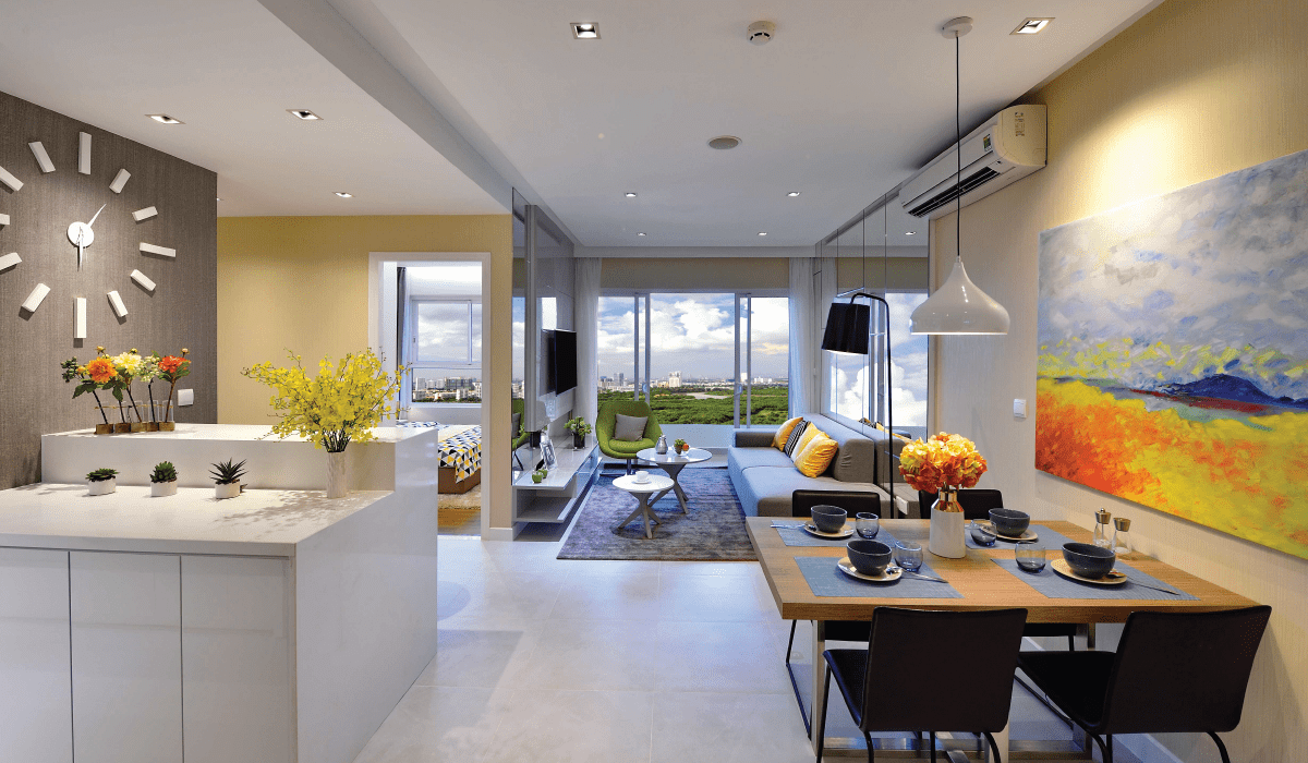 Nội thất bàn giao căn hộ Dragon Hill Residence and Suites 2 tinh tế và tranh nhã, xứng tầm với phong cách sống hiện đại của gia chủ. Đẳng cấp thể hiện trong sự tiện nghi sang trọng của cuộc sống huy hoàng và thịnh vượng. Căn hộ Dragon Hill 2 sử dụng màu pastel dịu nhẹ, với một vài món nội thất điểm nhấn xanh dương cá tính, chính vì vậy mà gia chủ không chỉ sở hữu không gian sống dịu nhẹ mà còn trẻ trung, đầy sức sống. Bàn coffee đôi sử dụng khung kim loại mạ chrome vàng, kết hợp với mặt đá marble vô cùng sang trọng. Ngoài ra với thiết kế thông minh, có thể gấp gọn cũng giúp tiết kiệm được không gian khi cần.