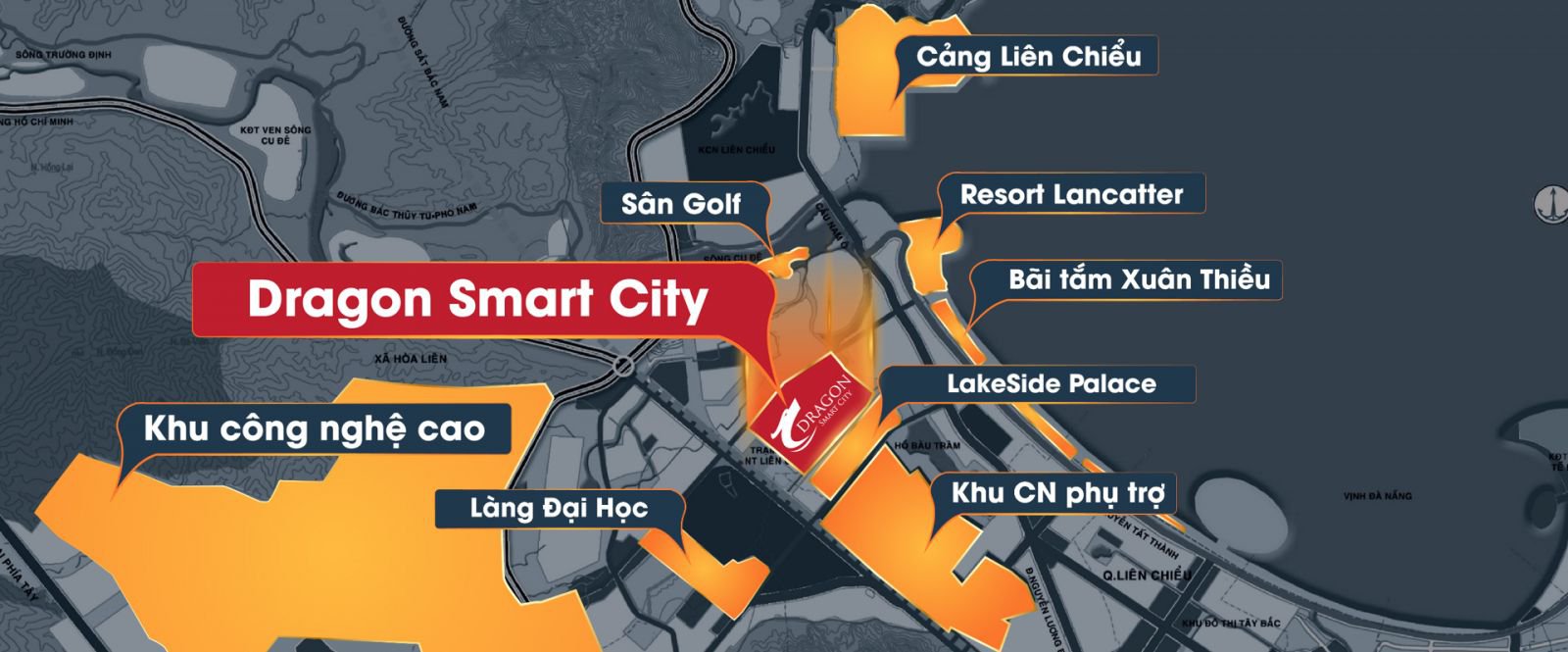 Dragon Smart City – “Đô thị Châu Âu giữa lòng Đà Nẵng” ,khu đô thị với con Rồng thuần Việt thời Lý được biểu hiện thành Công Viên Rồng, một khu cây xanh công cộng kéo dài từ Tây Nam qua Đông Bắc khu đất. Dự án được đầu tư với quy mô lớn gồm nhiều hạng mục như: nhà phố, biệt thự và chung cư, diện tích cây xanh tạo cảnh quan và dịch vụ tiện ích với diện tích lên đến 78 hecta với 2455 lô đất ở chia lô liên kế và căn biệt thự quy hoạch trong một khu vực có đầy đủ hệ thống hạ tầng chất lượng, không gian xanh, tiện ích công và dịch vụ khép kín đảm bảo tiêu chuẩn sống đô thị Châu Âu.