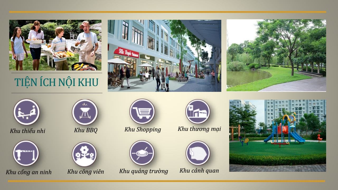 Sân cầu lông, cụm cao tầng thương mại (dự kiến), hồ bơi (dự kiến), hồ cảnh quan, cụm chung cư kết hợp thương mại, khu dưỡng sinh, gym, sân chơi trẻ em, cụm trường học, quảng trường.