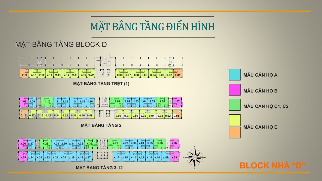 Block D có 352 căn hộ, tầng 1 có 18 căn shophouse, tầng 2 có 16 căn hộ, từ tầng 3 – 12 có 33 căn/sàn. Block D có 4 thang máy và 3 thang thoát hiểm.