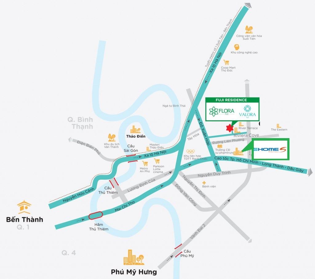 Dự án liền kề các khu đô thị, trung tâm thương mại, trường học, bệnh viện quốc tế tại Khu Đông Sài Gòn như: KĐT Nam Rạch Chiếc, KĐT Sala Thủ Thiêm, KĐT An Phú – An Khánh, hệ thống trường quốc tế Canada, Việt Mỹ, các trung tâm thương mại Vincom Mega Mall, Parkson Cantavil, …..