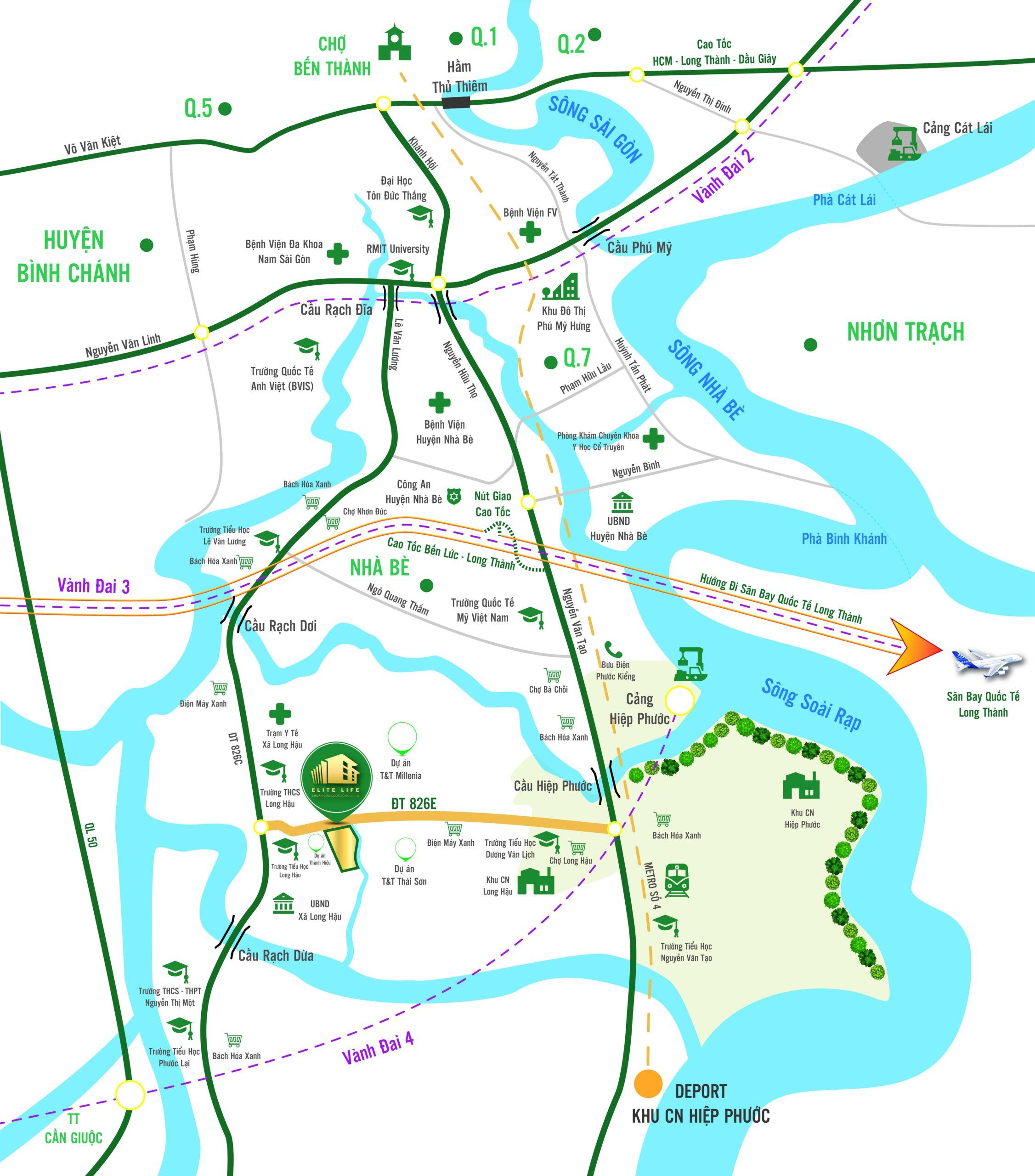 Elite Life toạ lạc ngay Xã Long Hậu, huyện Cần Giuộc, tỉnh Long An. Đây là khu vực đầu mối giao thông của tỉnh Long An. Như Đại lộ Long Hậu với lộ giới lên đến 40M (6 làn xe) kết nối cảng Quốc tế Hiệp Phước, tuyến cao tốc Bến Lức Long Thành kết nối từ Đông sang Tây; 3 CẢNG QUỐC TẾ HIỆP PHƯỚC, tuyến đường vành đai 3 và 4 góp phần kết nối các Quận, Huyện và các tỉnh vùng ven TP.HCM; đại lộ Nguyễn Hữu Thọ vào đô thị Phú Mỹ hung và Trung tâm TP.HCM.