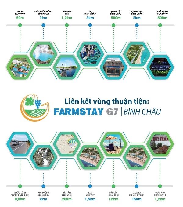 • TừFarmstay G7 Bà Rịađến đường ven biển, cụm resort nghỉ dưỡng cao cấp như Hodota, Danh Việt, Cát vân, bến xe, chợ hải sản Bình Châu chỉ mất 3 phút xe máy