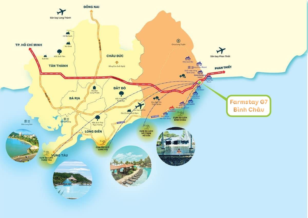Vị trí Farmstay G7 Bình Châu nằm trong thủ phủ Resort Hồ Tràm – Bình Châu, một trong những vị trí tam giác vàng của 3 sân bay: Sân bay Lộc An, Long Thành, Phan Thiết.