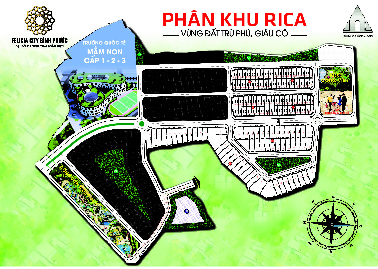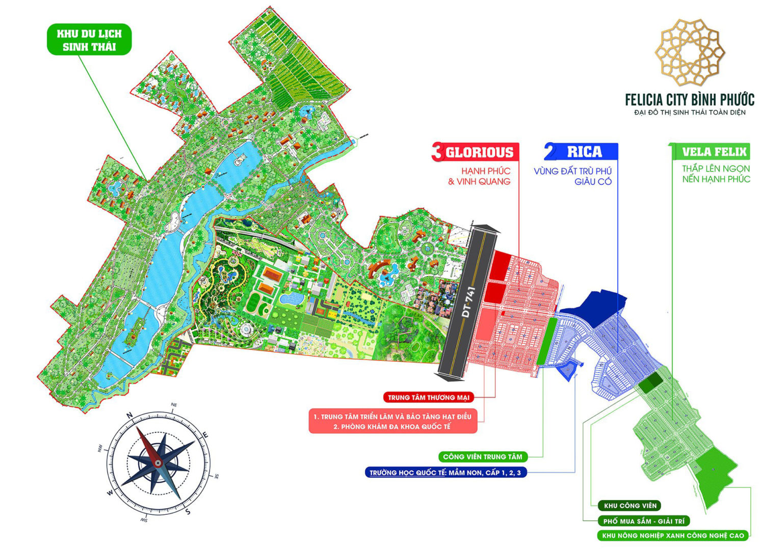Theo đó, 3 phân khu chính Phân khu Rica, Phân khu Glorious, Phân khu Vella Felix được triển khai dựa theo địa hình tự nhiên, hạn chế đến tối thiểu tác động đến thế đất và cảnh quan vốn có, đồng thời đẩy mạnh tôn tạo, tái lập và phát triển mảng xanh bền vững.