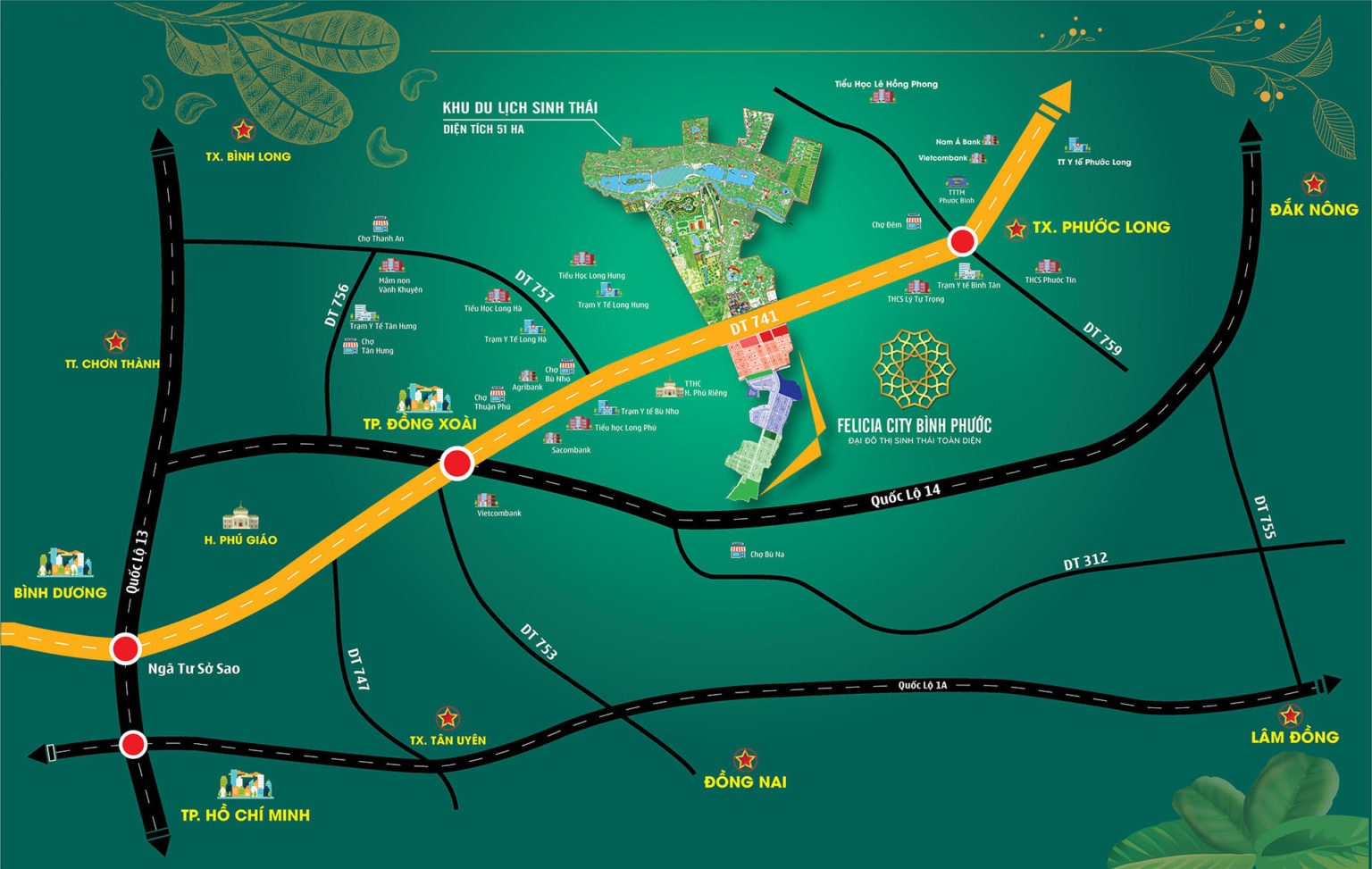 DT741 của khu đô thị Felicia City có điểm đầu là ngã tư Sở Sao (giao với quốc lộ 13) thuộc địa phận thành phố Thủ Dầu Một và thị xã Bến Cát, đi qua các huyện Bắc Tân Uyên, Phú Giáo (tỉnh Bình Dương), các huyện thị Đồng Phú, Đồng Xoài, Phú Riềng, Phước Long, Bù Gia Mập và điểm cuối giao với tỉnh lộ 686 tại thôn 2, xã Quảng Trực, huyện Tuy Đức, tỉnh Đắk Nông. Tỉnh lộ 741 giao với quốc lộ 14 tại ngã tư Đồng Xoài.