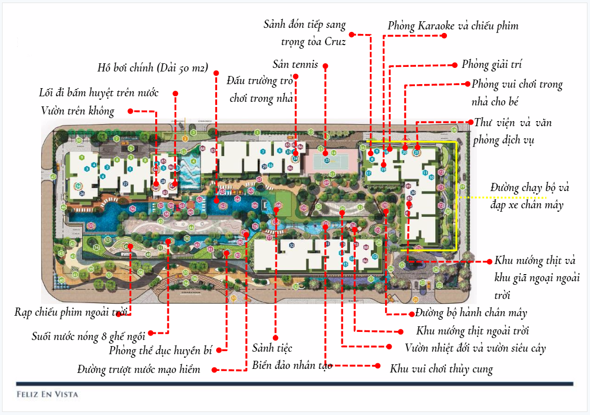 Dự án Feliz En Vista có hơn 100 tiện ích được thiết kế độc đáo với sự đan xen giữa phong cách khu nghỉ dưỡng và phong cách sống năng động.