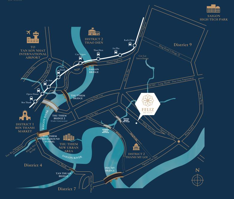 Từ căn hộ Feliz En Vista bạn dễ dàng kết nối giữa siêu thị Metro An Phú và tuyến tàu điện Metro số 1 (Bến Thành – Suối Tiên) trong vòng 10 phút, cách cầu Phú Mỹ 10 phút …. Đặc biệt liền kề với khu đô thị mới Thủ Thiêm (là Trung tâm tài chính mới của Thành phố Thủ Đức) .