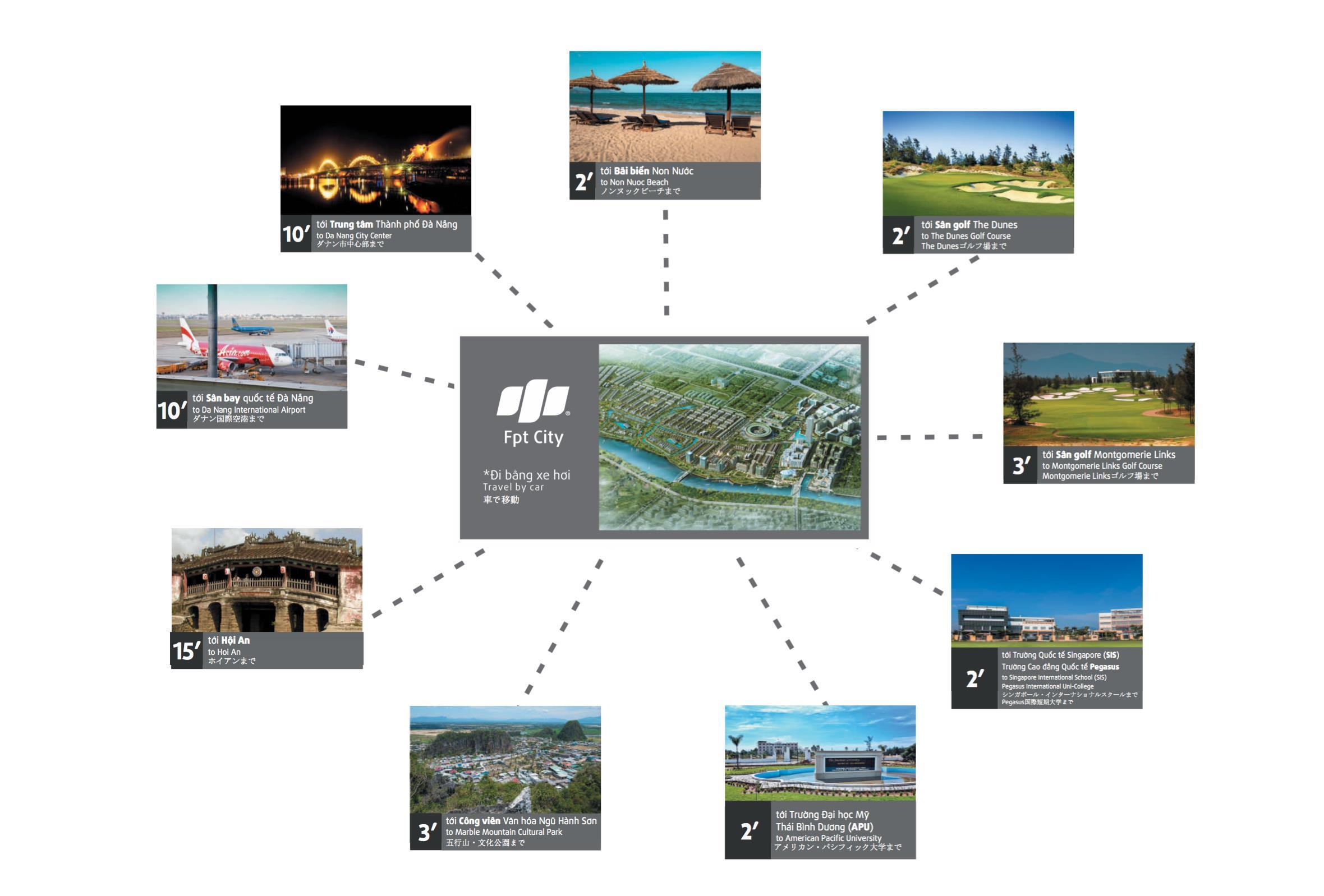 Từ bất kỳ vị trí nào trong FPT City Đà Nẵng, cư dân chỉ mất vài phút để tiếp cận các tiện nghi sinh hoạt, làm việc và giải trí trong khu đô thị và các khu vực gần kề. Hạ tầng xã hội hoàn chỉnh và quy hoạch thiết kế nhằm mang lại sự thuận tiện tối đa cho cuộc sống cư dân tại đây.