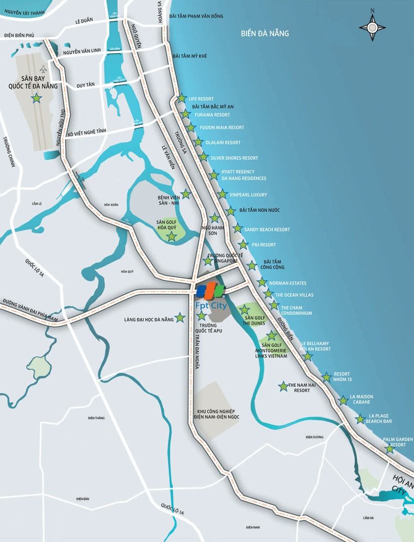 Với địa thế kề sông, gần biền và nằm trên trục đường phát triển du lịch Đà Nẵng – Hội An, FPT City Đà Nẵng sở hữu một vị trí chiến lược khi nằm giữa hai trung tâm du lịch lớn và dọc theo tuyến du lịch đường sông Cổ Cò từ Đà Nẵng vào Hội An, chỉ cách sân bay quốc tế Đà Nẵng và trung tâm thành phố 10 phút xe hơi.