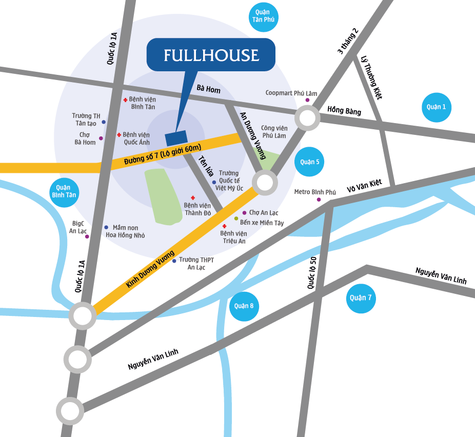 Căn hộ Full House nằm ngay khu Tên Lửa sầm uất bậc nhất quận Bình Tân với mặt tiền đường số 7 rộng 60m, vị trí quan trọng giúp bạn nhanh chóng di chuyển đến trung tâm Quận 6, và chỉ cần 15 phút là đã vào trung tâm Quận 3, 5, một vị trí cực kỳ thuận lợi.