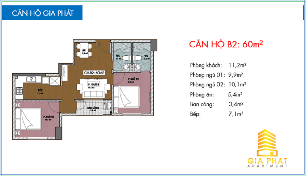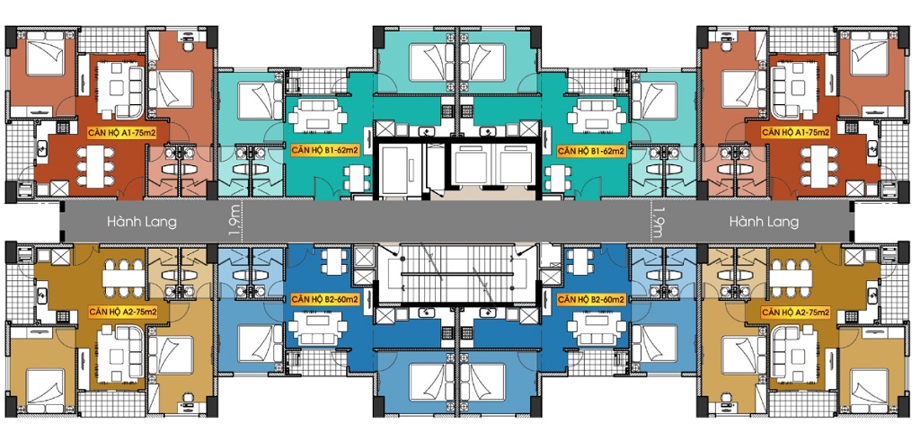 Diện tích căn hộ 60 m2 – 75 m2 (2 PN)