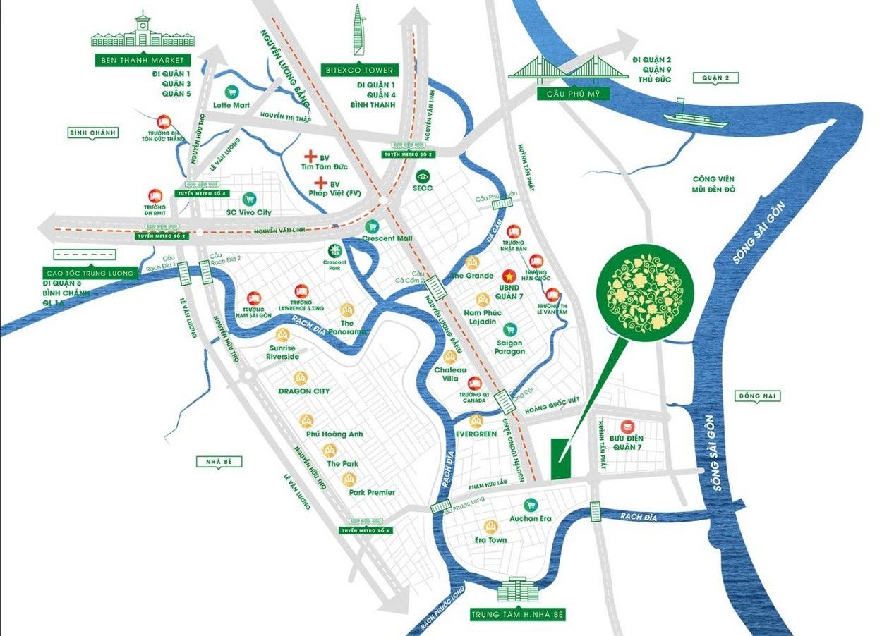 + Về y tế: Bệnh viện Tim Tâm Đức, bệnh viện Đa khoa Nam Sài Gòn, bệnh viện Việt Pháp,..