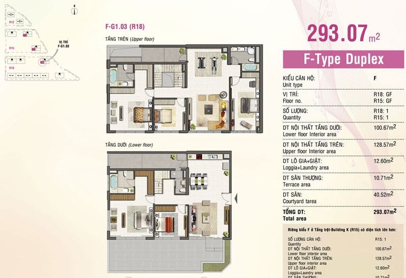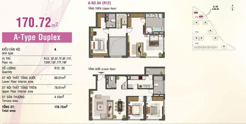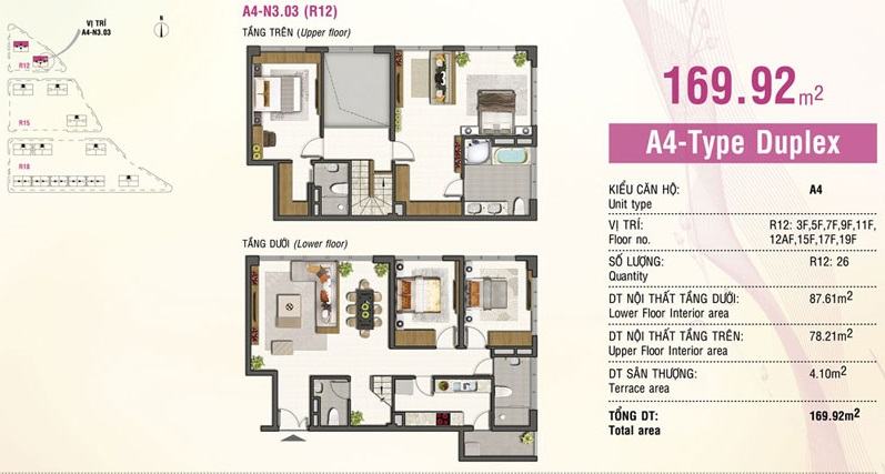 Căn hộ hai tầng (duplex) có diện tích từ 170- 325m2, đáp ứng nhu cầu không gian nhà ở có diện tích rộng, tạo nhiều tầng không gian sinh động, sang trọng và có thêm công năng sử dụng bố trí phòng làm việc, không gian sinh hoạt gia đình…