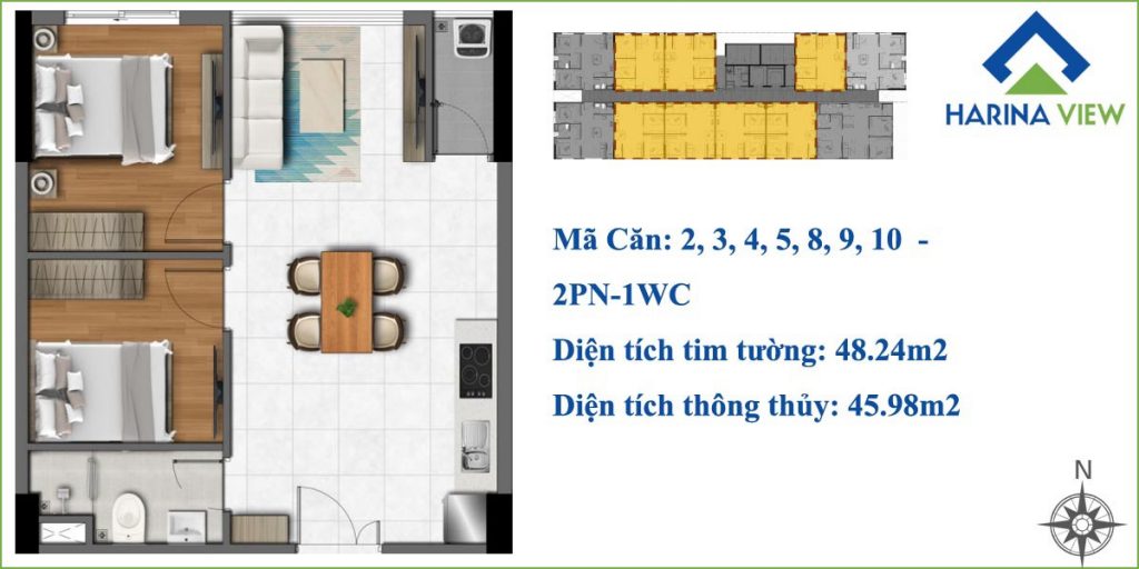 Dự án chung cư Harina View Phạm Văn Đồng Thủ Đức cung ứng 121 căn hộ ra thị trường. Cụ thể gồm 9 căn officetel, 121 căn hộ tiêu chuẩn diện tích 48,24 – 72m2 (thiết kế 2 – 3 phòng ngủ) và 11 căn penthouse.