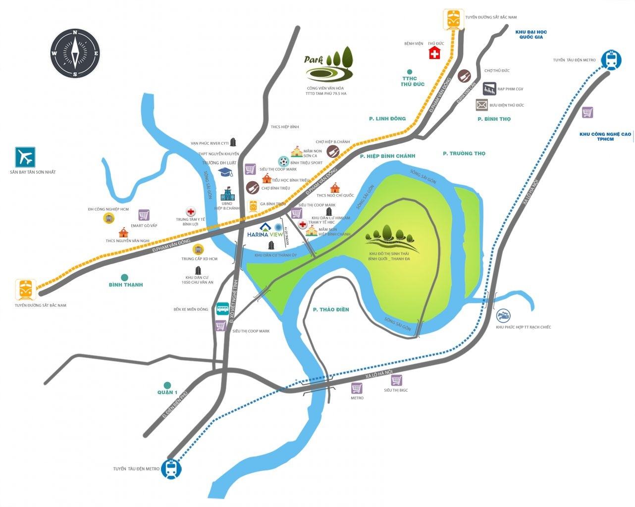 Dự án kế cận chợ Thủ Đức chỉ cách khoảng 3 phút đi bộ, gần bến xe Miền Đông, khu du lịch – công viên Bình Quới Thanh Đa. Lân cận dự án Harina View còn bao gồm các tiện ích: siêu thị coop Mart, trạm y tế Hiệp Bình Chánh, mầm non Hiệp Bình Chánh, UBND Hiệp BÌnh Chánh,… tạo sự thuận tiện cho cuộc sống cư dân.