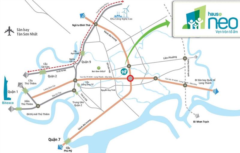 Đây là vị trí không chỉ thuận lợi về mặt giao thông, di chuyển mà còn được đánh giá cao về cơ sở hạ tầng kết nối vì Hausneo thuộc vị trí tam giác vàng của khu vực Miền Đông Nam Bộ (là giao điểm giao thông của 3 tỉnh Đồng Nai, TP. HCM, Bà Rịa Vũng Tàu).