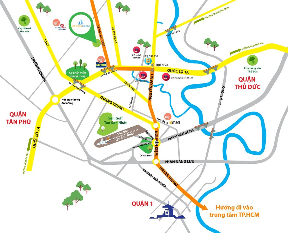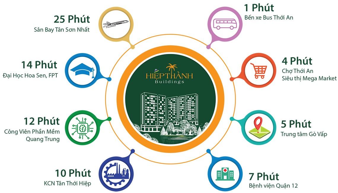 Cho thuê căn hộ Hiệp Thành Buildings giá rẻ còn thừa hưởng các tiện ích ngoại khu đầy đủ, đẳng cấp. Từ đây cư dân chỉ mất 1 phút đến trạm xe buýt, 2 phút đến chợ Thới An, khoảng 5 phút đến quốc lộ 1A, 5 phút đến UBND quận 12, 5 phút đến MM Mega Market, 7 phút đến Công Viên Phần Mềm Quang Trung, 10 phút đến Trung tâm quận Gò Vấp, 25 phút đến Sân bay Tân Sơn Nhất.