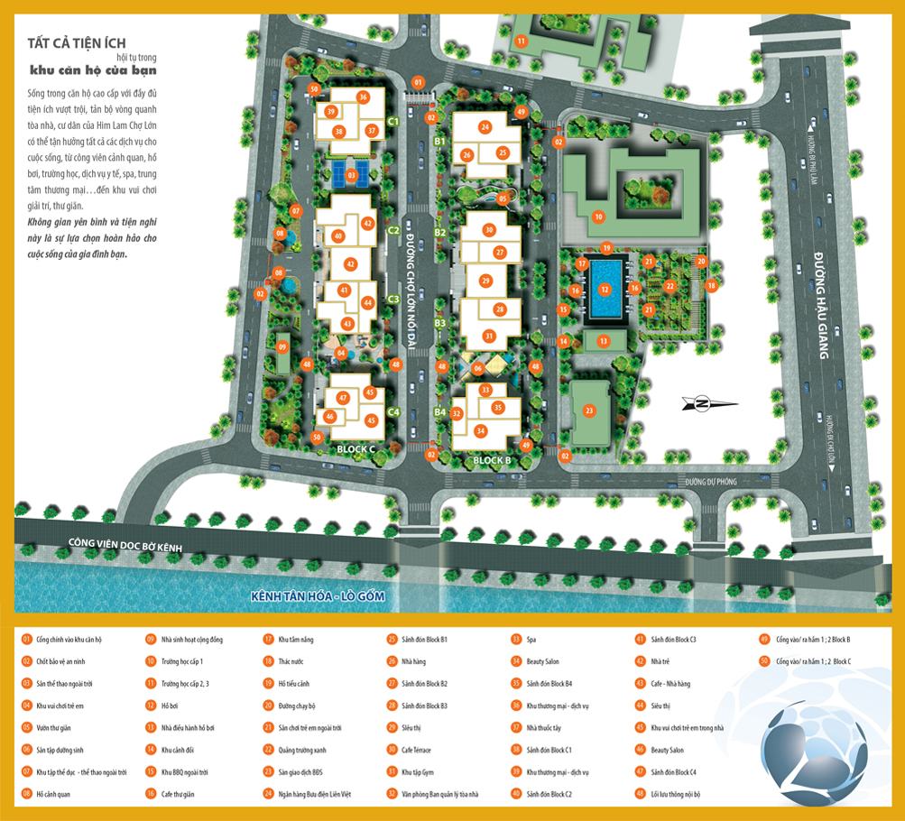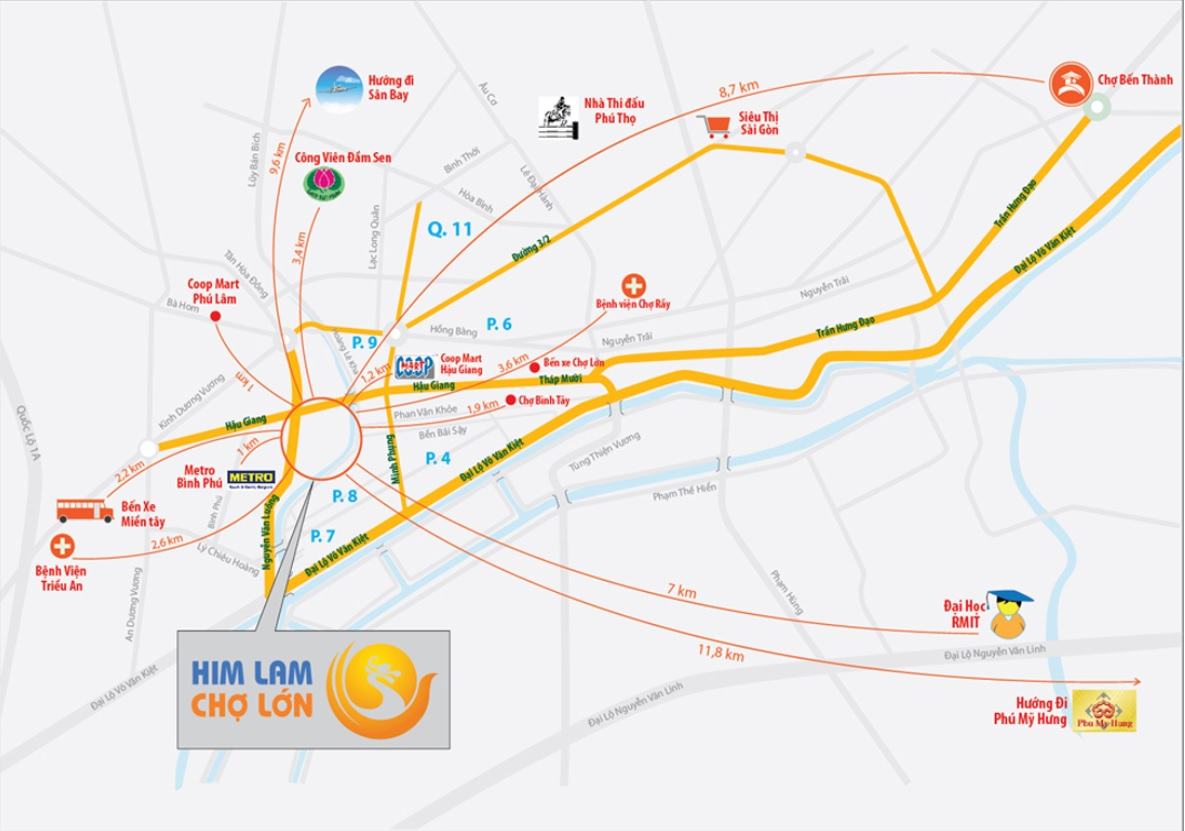 Dự án Him Lam nằm cách mặt tiền Hậu Giang chưa đầy 120m và liên kết cùng khu vực Chợ Lớn khoảng 1.8km. Bên cạnh các khu dân cư hiện hữu, nơi đây được đầu tư cơ sở hạ tầng và cơ sở kỹ thuật hiện đại.