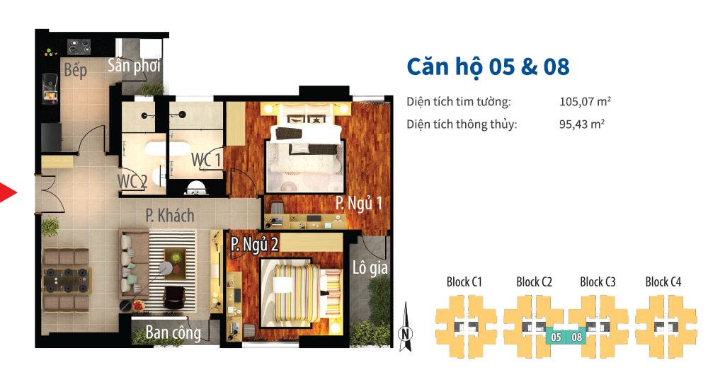 Diện tích căn hộ: 82 – 102 m2 loại 2 – 3 phòng ngủ.