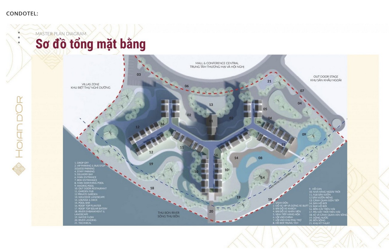 Là một tổ hợp du lịch nghỉ dưỡng sinh thái và trải nghiệm văn hoá, dự án Hội An D’or sở hữu hệ thống tiện ích đẳng cấp như bến thuyền, không gian văn hoá, quảng trường cộng hưởng, tuyến phố đi bộ, khách sạn 5 sao, trung tâm thương mại, nhà hàng cao cấp, công viên sinh thái.