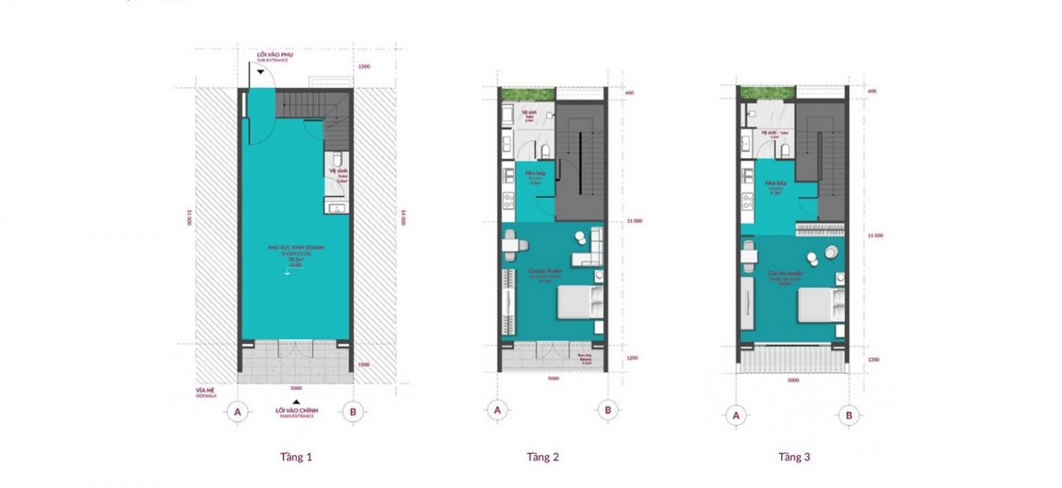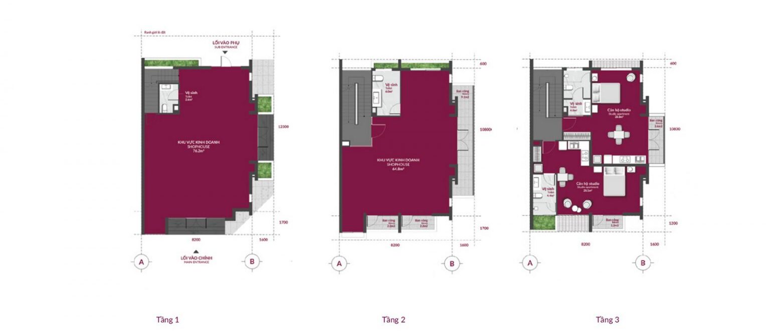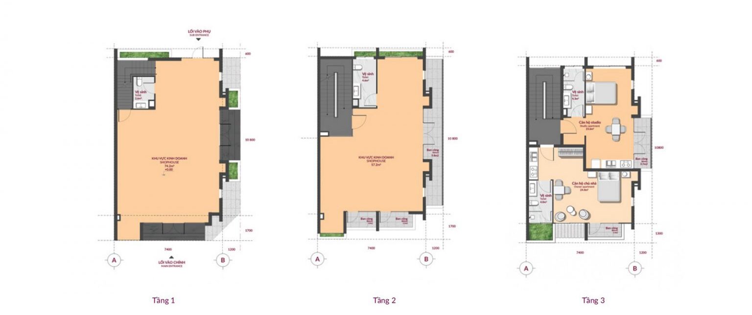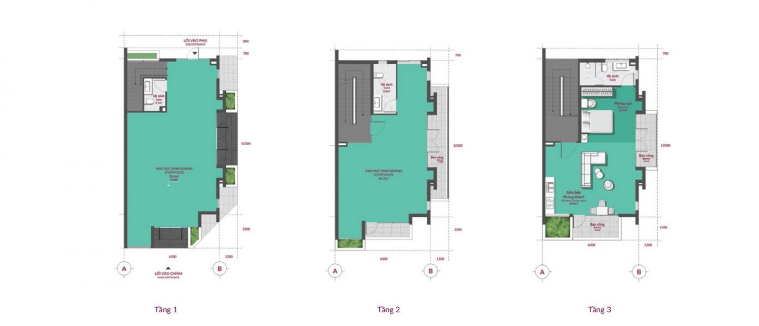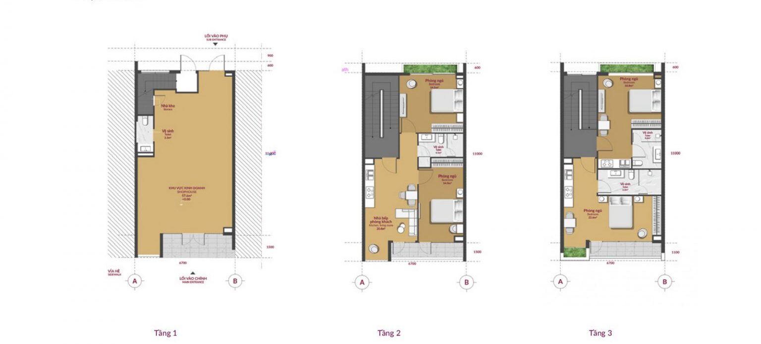 – Phân khu shophouse Maison De Ville: Các căn shophouse được thiết kế theo lối kiến trúc phố cổ. Mỗi căn shophouse tại dự án sở hữu 2 mặt tiền với cửa trước dành cho shophouse tầng 1, cửa sau giáp đường nội khu rộng 3m dành cho lối đi lên tầng 2, tầng 3.