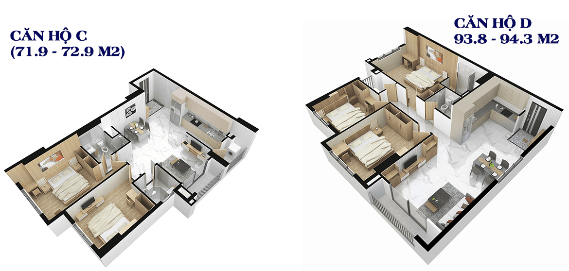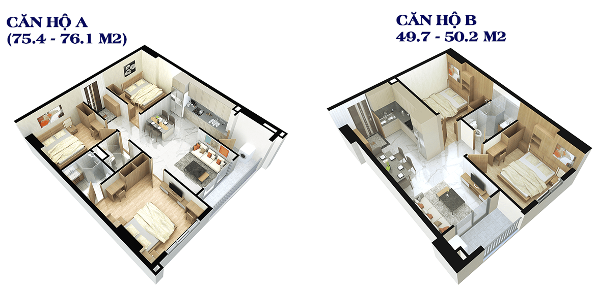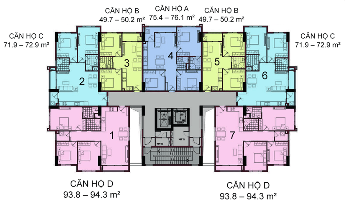 | Diện tích | Căn hộ A: 75.4 – 76.1 m2 (3 Phòng ngủ – 2WC) Căn hộ B: 49.7 – 50.2 m2 (2 Phòng ngủ – 1WC) Căn hộ C: 71.9 – 72.9 m2 (2 Phòng ngủ – 2WC) Căn hộ D: 93.8 – 94.3 m2 (3 Phòng ngủ – 2WC) |