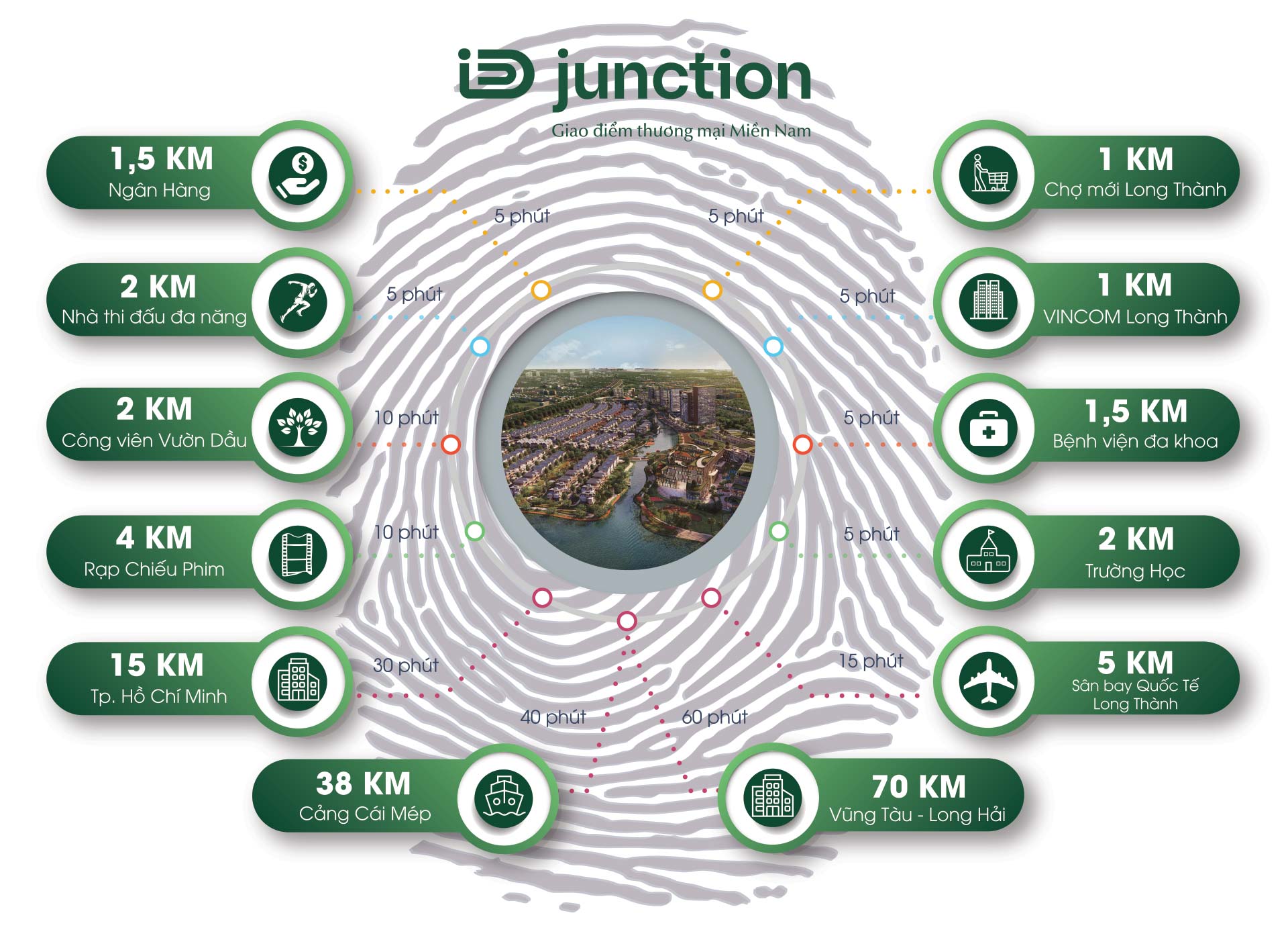 iD Junction nằm trong khu vực “Tam giác vàng của logistics” tương lai của miền Nam, hình thành bởi cảng hàng không Quốc tế Long Thành và nút giao cao tốc TPHCM – Long Thành và quốc lộ 51, Cảng Cái Mép – Thị Vải đang là vị trí kết nối liên vùng, thông thương Quốc tế thuận lợi nhất mà chưa có dự án nào tọa lạc tại trung tâm Long Thành có được. Là khu đô thị giao thoa về vị trí, về kinh tế – xã hội, iD Junction sẽ trở thành giao điểm thương mại miền Nam, là miền đất tương lai cho công dân toàn cầu.