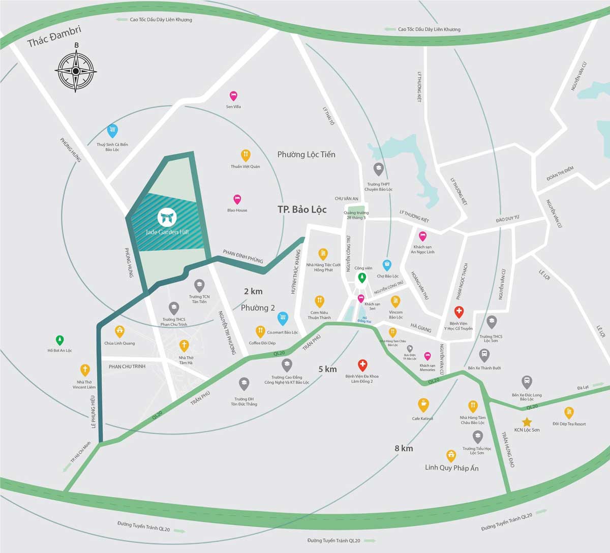 Vị trí chiến lược khu dân cư Jade Garden Hill nằm tại nằm trên trục đường Phùng Hưng giao với Phan Đình Phùng lớn nhất Bảo Lộc. Đây là tuyến đường lớn nhất Bảo Lộc. Từ đây, cư dân dễ dàng di chuyển vào trung tâm Thành Phố Bảo Lộc và cơ quan hành chính của Tỉnh, thông qua tuyến đường Huỳnh Thúc Kháng. Ngoài ra, cũng dễ dàng di chuyển đến các khu vực lân cận như TP Đà Lạt, TP HCM, TP Biên Hoà..