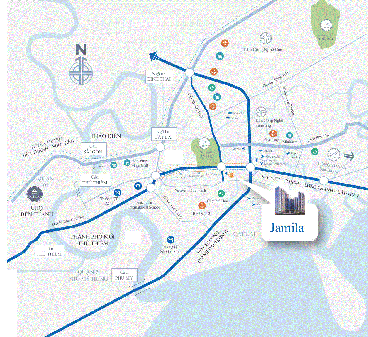 Jamila Khang Điền tọa lạc ngay trên mặt tiền đường Song Hành, Cao tốc Long Thành – Dầu Giây TP. HCM (ngay nút giao Đỗ Xuân Hợp), dễ dàng kết nối đến Trung tâm Quận 1, TP. Thủ Đức, Quận 7 và vùng lân cận chỉ trong vài phút di chuyển. Đặc biệt, vị trí chiến lược giúp cư dân thuận tiện di chuyển đến đến các tiện ích lân cận: trường học, bệnh viện, khu công nghệ cao, v.v.