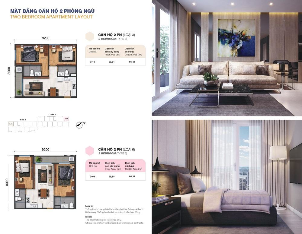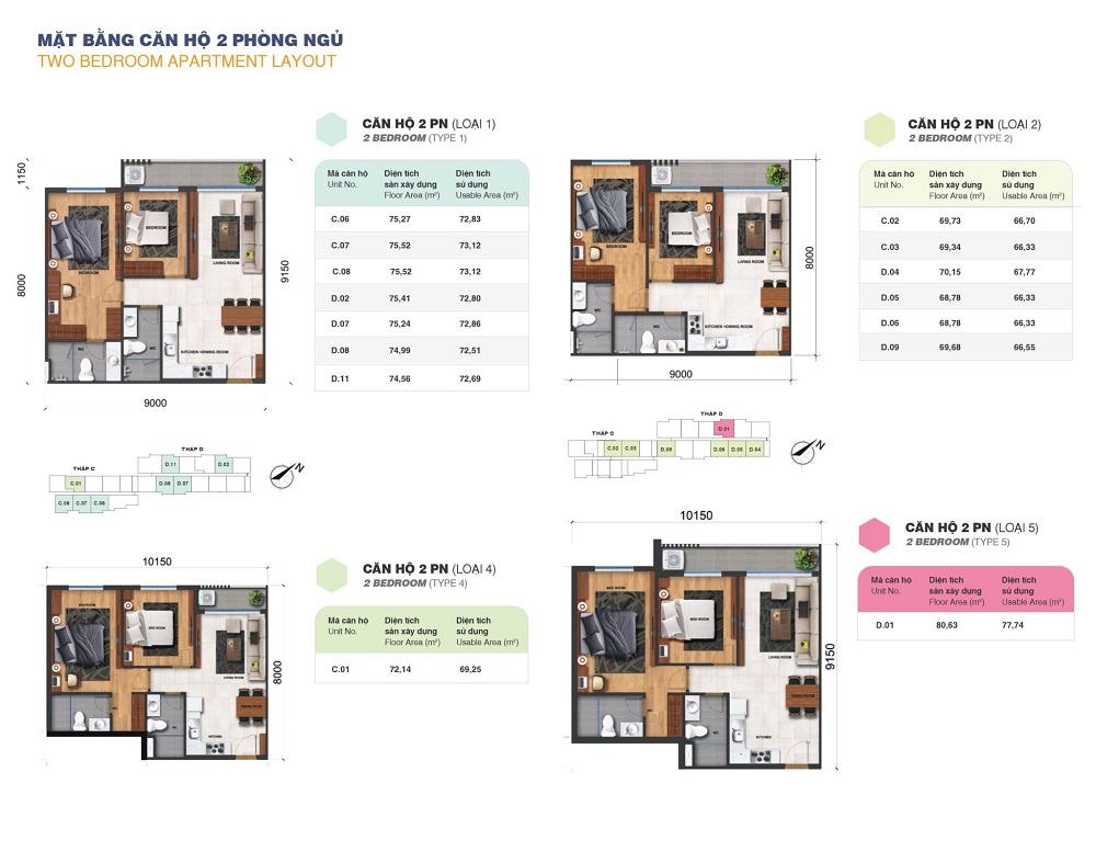 | Căn hộ 2 phòng ngủ – 2 nhà vệ sinh | 69 – 75m2 | 2.6 – 3 tỷ | Giá đã bao gồm phí VAT, sổ hồng và phí bảo trì căn hộ |