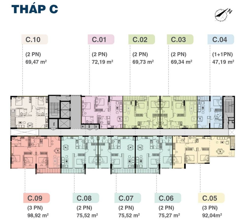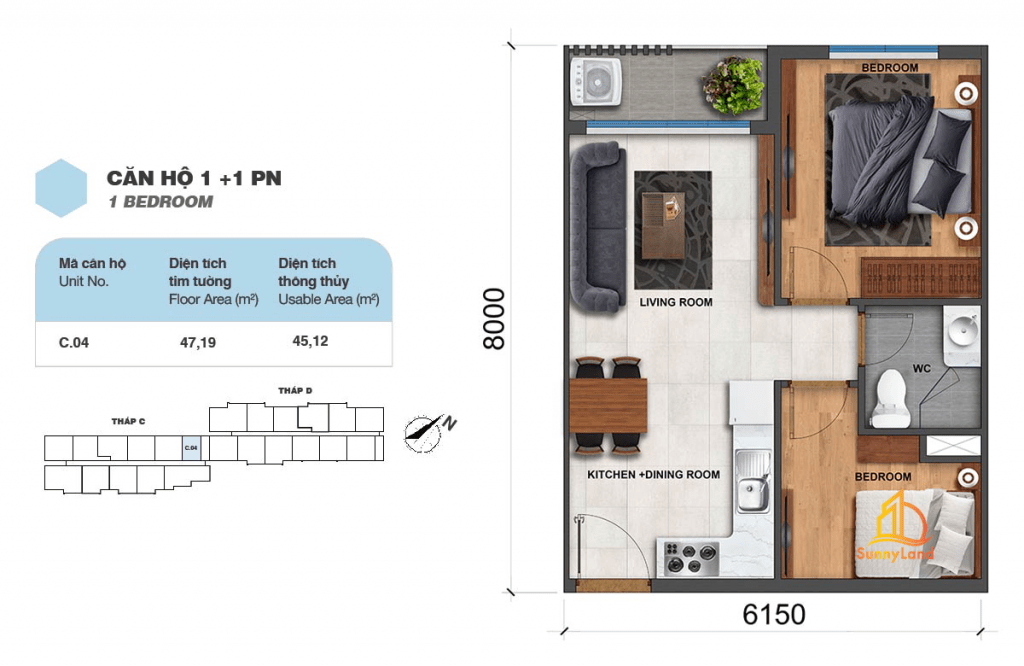 | Căn hộ 2 phòng ngủ – 1 nhà vệ sinh – 47m2 | 2 – 2,2 tỷ | ||